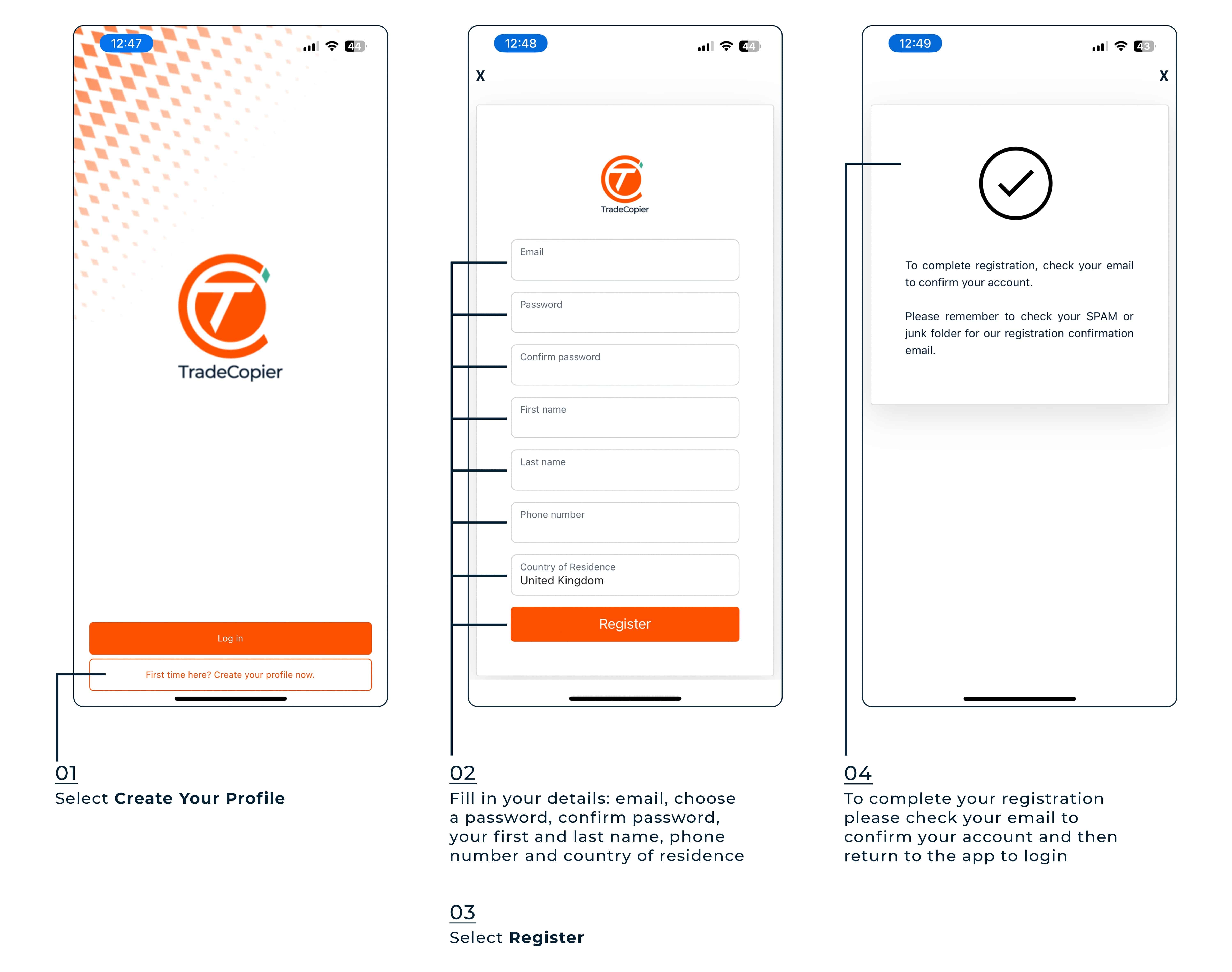 Create a profile by filling in your details, such as your email, password, first and last name, phone number, and country of residence.