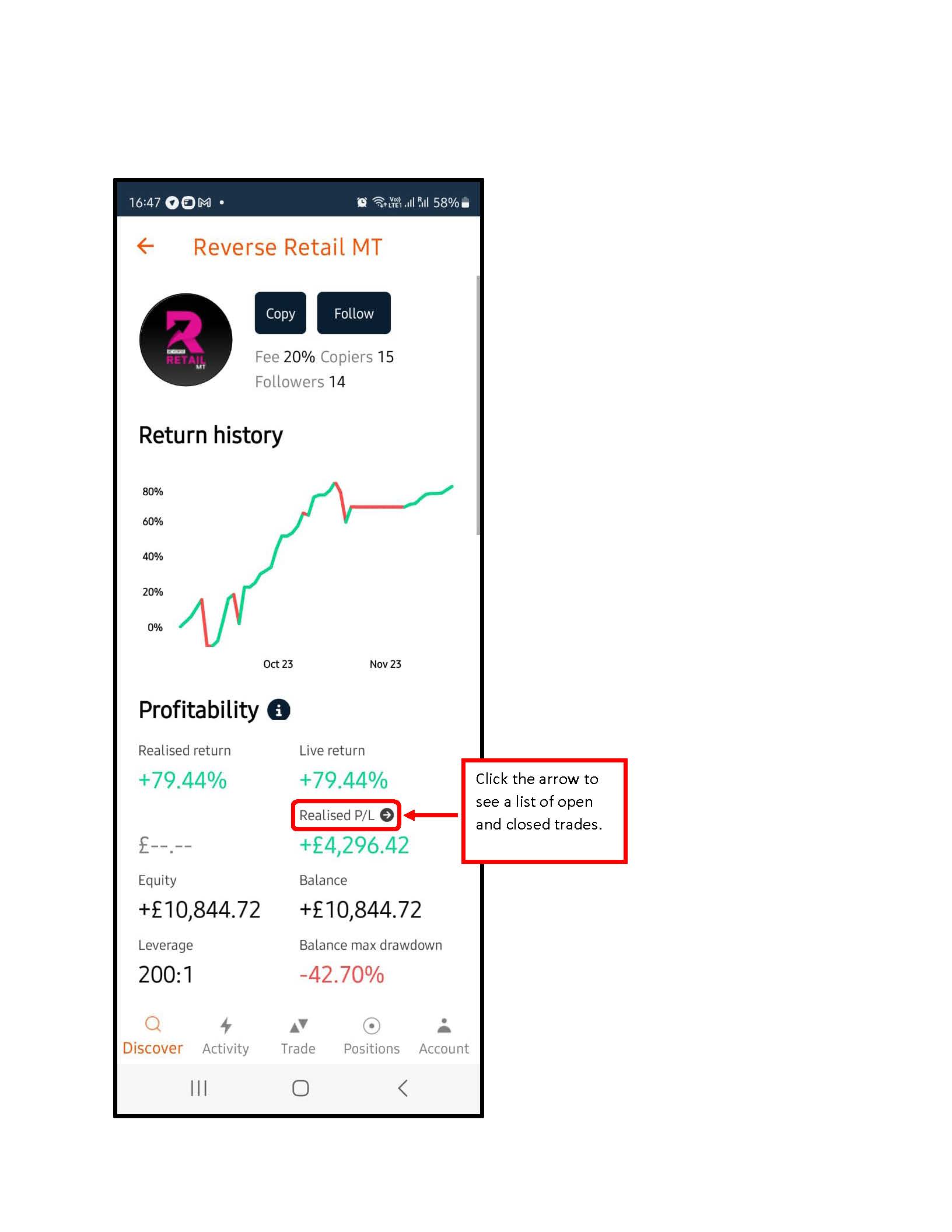Review their recent trades to determine current trading size and return (in amount and percentage). To review recent and open trades, click the arrow next to Realised P/L.