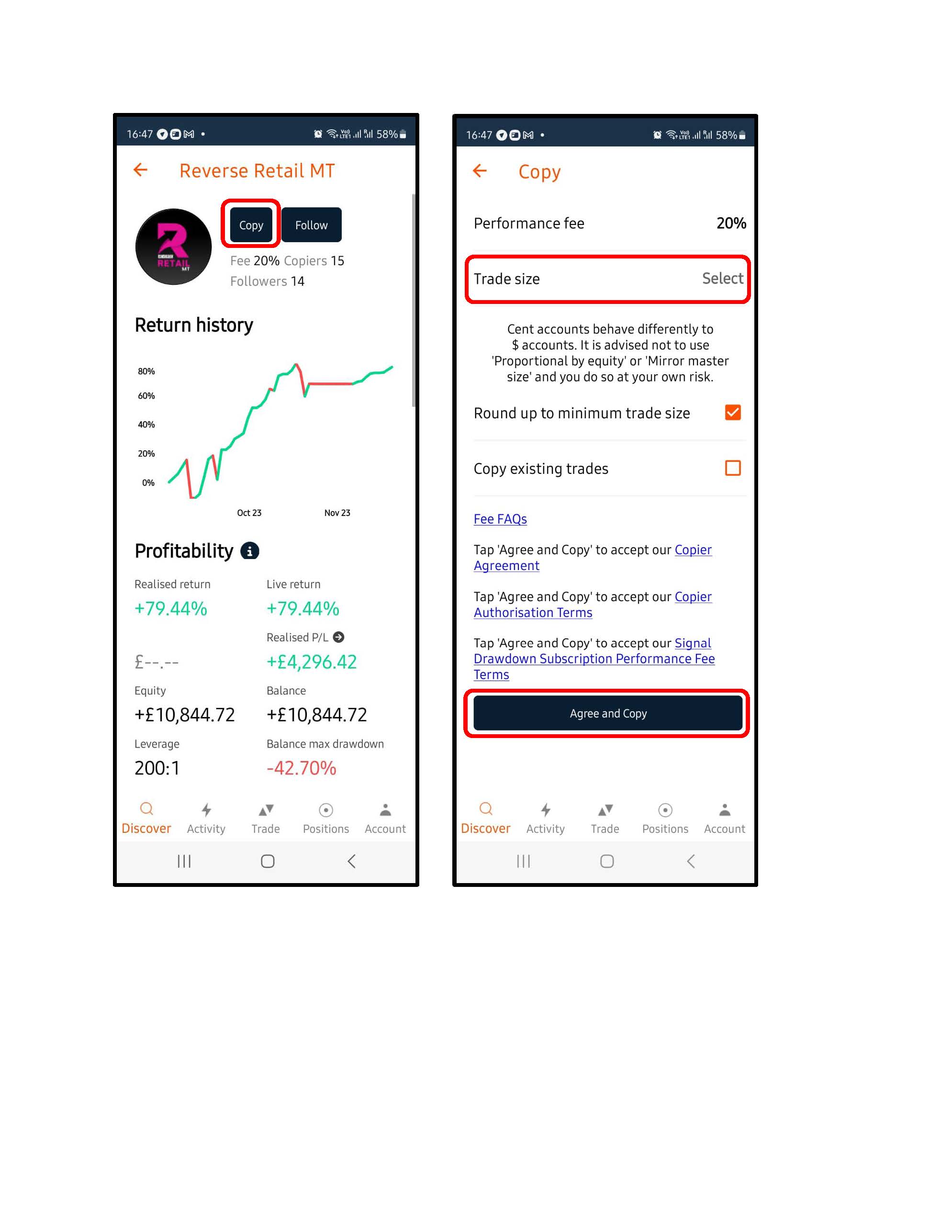 All your trades will be the same trade size as the Master Trader you are copying. This is most suitable if you have a similar account size to the Master Trader.